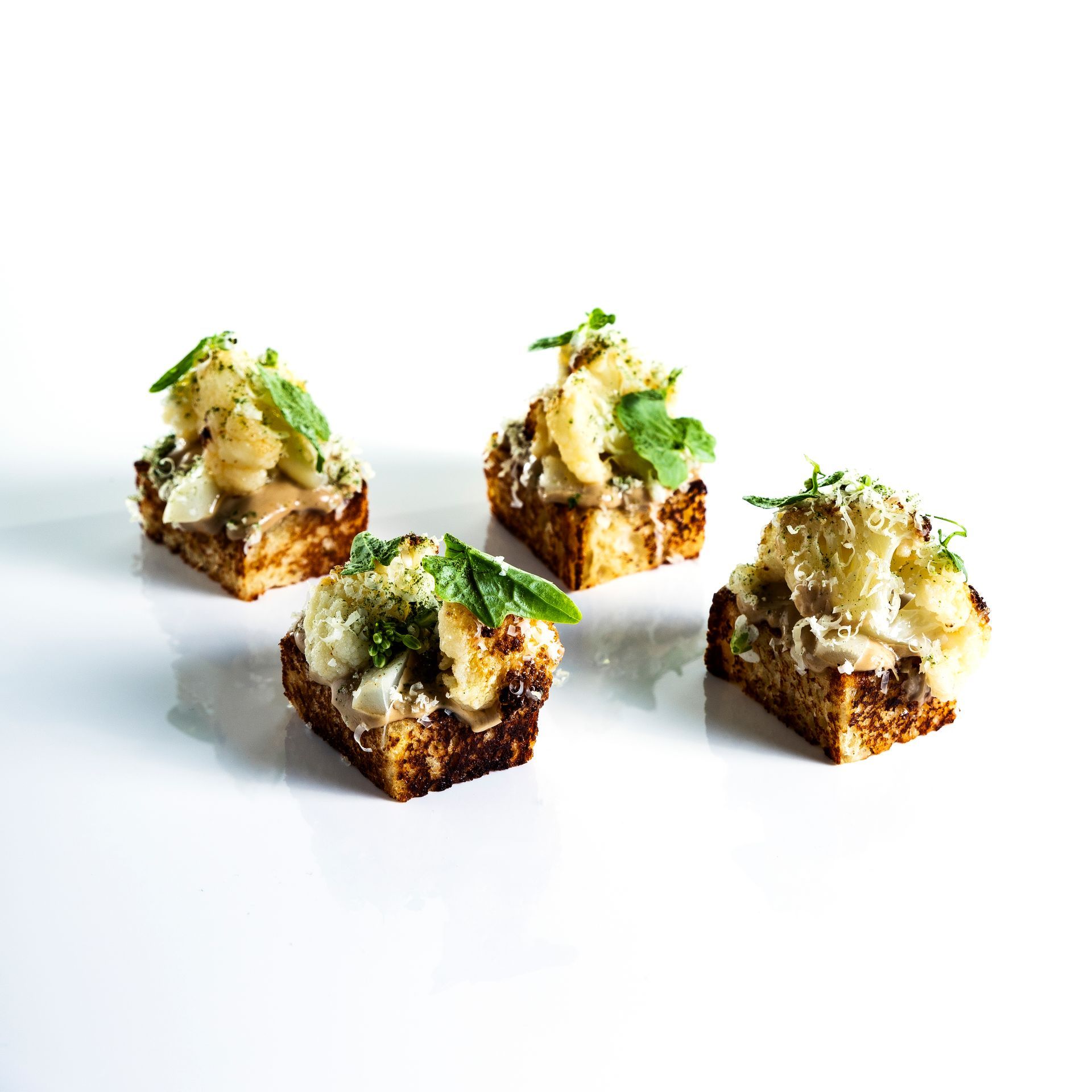 - Blómkál á ristuðu brauði, svart hvítlaukskrem, vegan parmesan, kryddjurtir