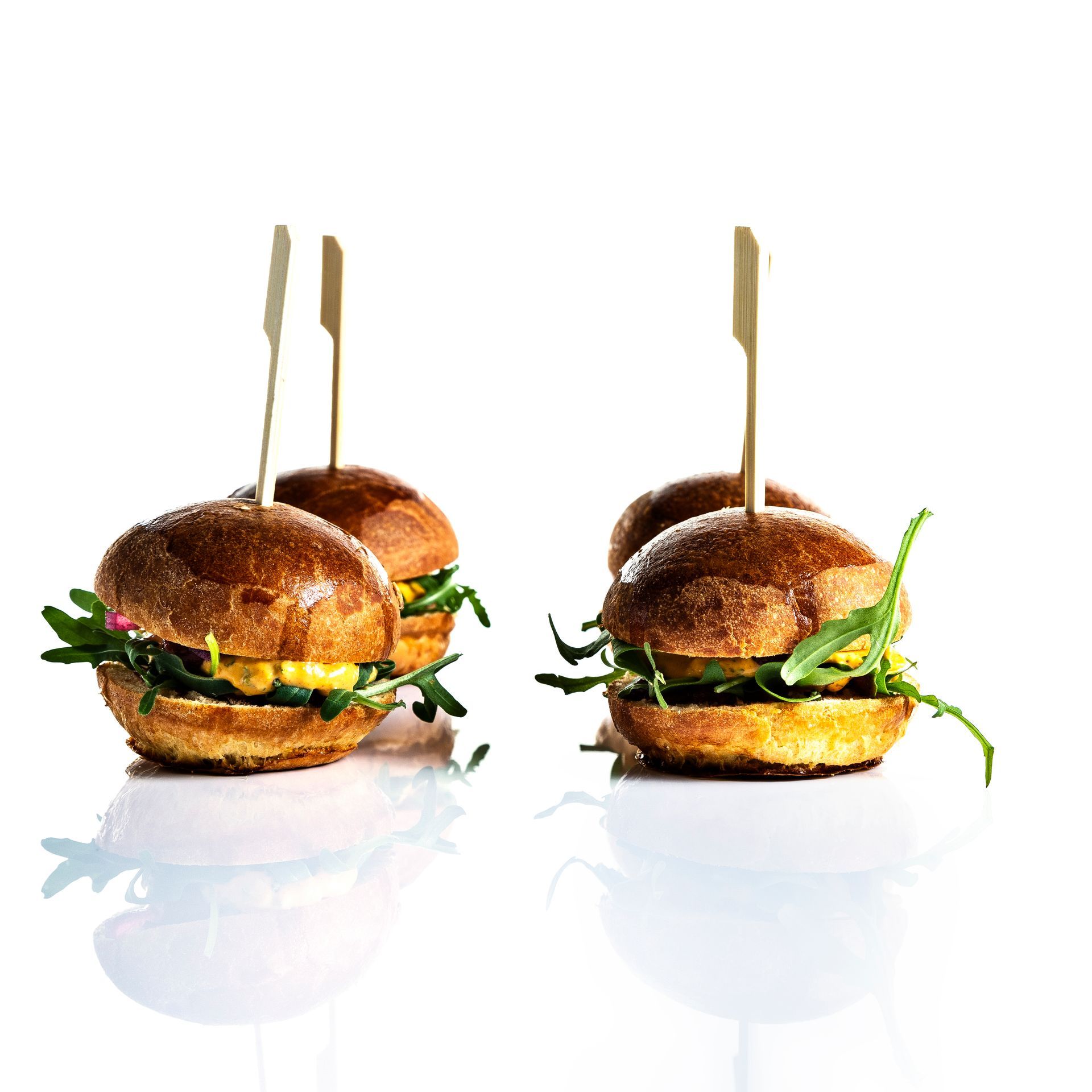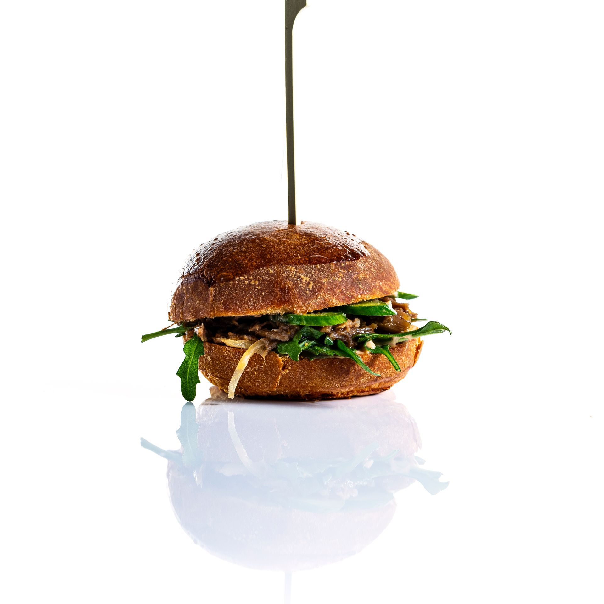 - Vegan baunabuff, ristuðum lauk, marineraðri gúrku og vegan osti.