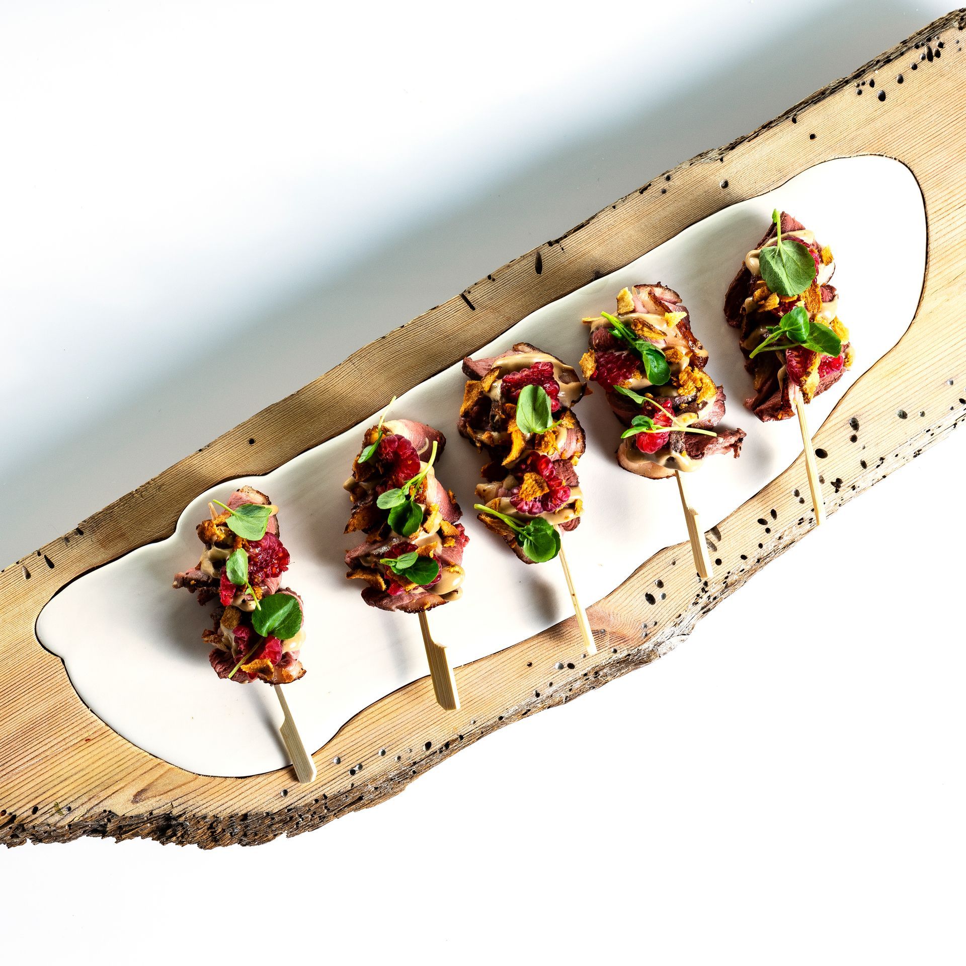 - Reykt andabringa, svartur hvítlaukur, stökkir jarðskokkar og hindber