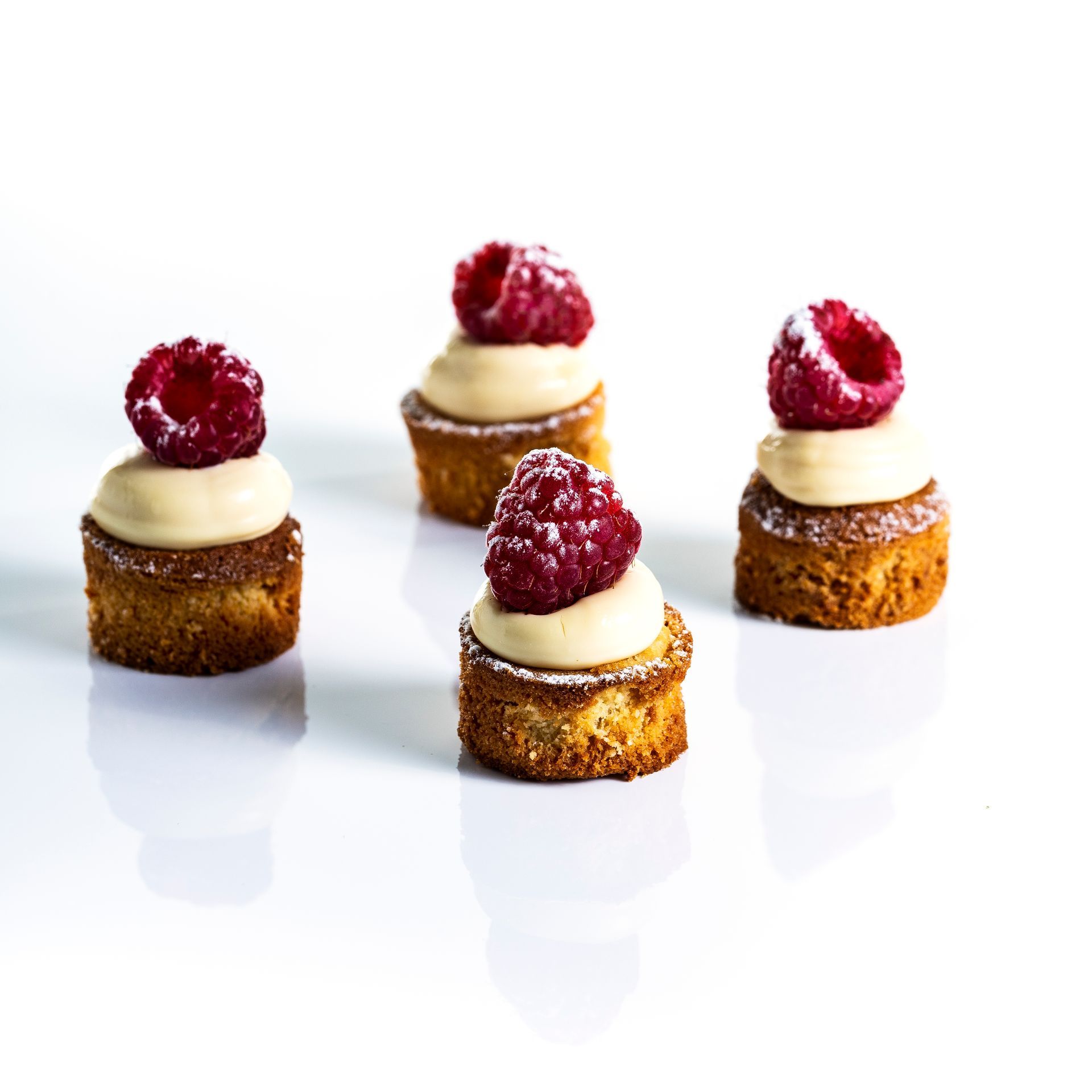 - Marsipankaka, möndlur, bakað hvítsúkkulaðikrem og hindber