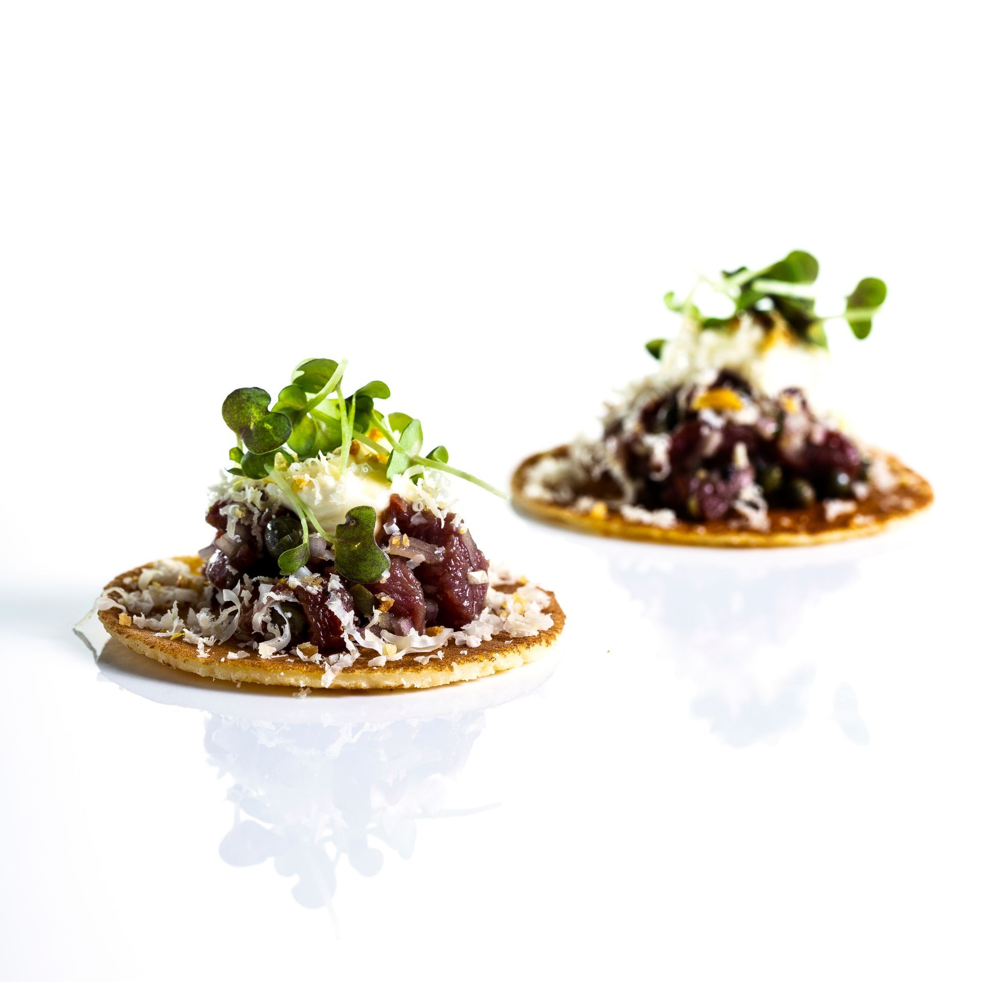 - Nautatartar á pönnuköku, piparrótarkrem, stökkur hvítlaukur og parmesan