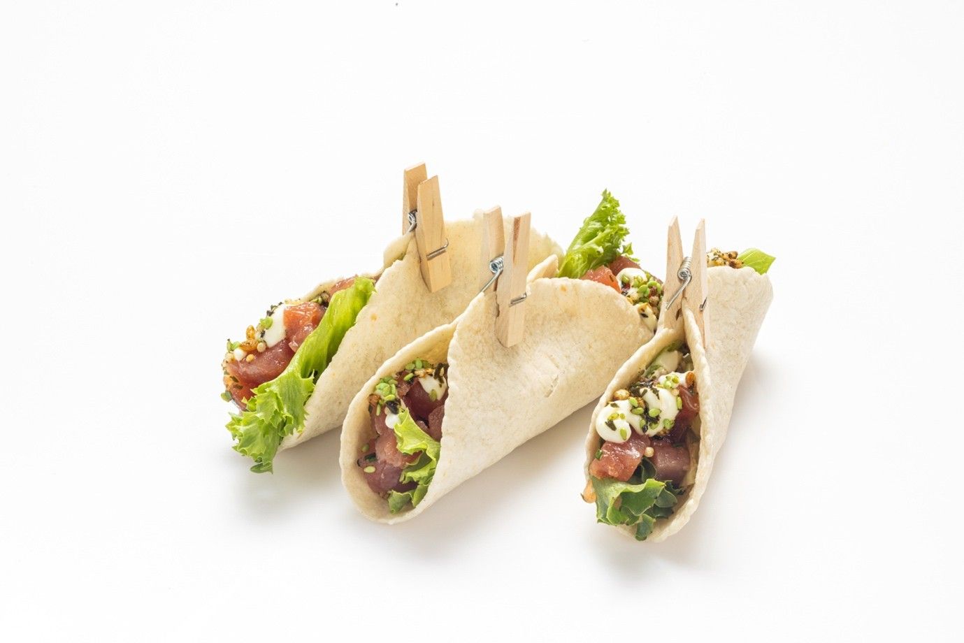 - Túnfisktartar í taco með yuzukremi, vorlauk og stökkum sesamfræjum